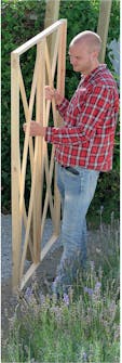 Rammen til espalierets fyldinger mellem stolperne skrues sammen af 20 x 45 mm lister. Rammen er delt i to felter, og i hver af dem spænder vi fire lidt spinklere lister på 12 x 20 mm lister op, så de danner et flot mønster af buer.