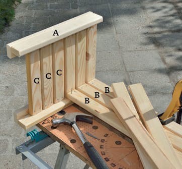 Spænd de nye ben sammen to og to med gavllister (C) imellem. Brug et par afstandslister (X) med en tykkelse på 1 cm, og begynd fra oven, og søm listerne fast med 1,8 x 35 mm dykkere i de benstykker (A), der kun er delvis frie.