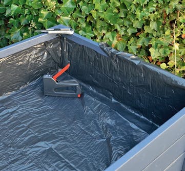 Plantekasserne fores indvendigt med kraftig plast. Det kan gøres fast til kassens sider med hæfteklammer. Prik nogle huller i plasten i mellemrummene mellem bundbrædderne, så overskydende vand kan rende fra.