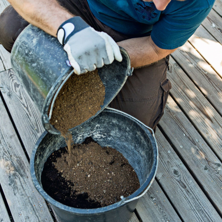 Blandingen laves 1:1, og mens mulden har til opgave at holde på fugtigheden, sørger sand/grus for, at jorden ikke bliver for kompakt.