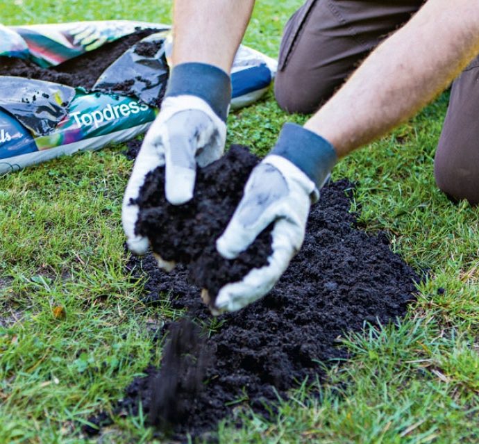 Du kan enten blande blomsterjord og murergrus i forholdet 1:1 eller købe en færdigblandet topdress i mindre poser i byggemarkedet eller på planteskolen. Har du flere huller, der skal udbedres, kan færdigblandingen bedst svare sig rent arbejdsmæssigt.