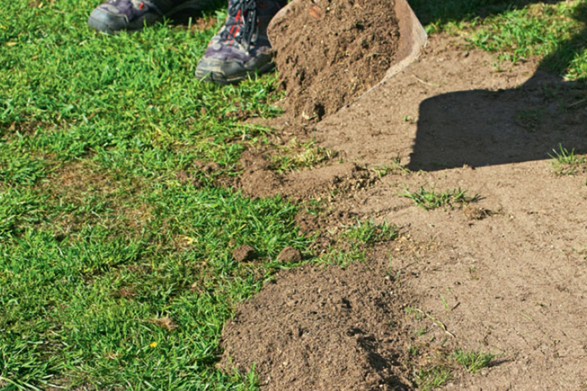 Før du kan begynde selve opretningen, skal du have overblik. Det får du bedst ved at klippe græsset helt kort og ved at fjerne mos og blade mv. Så kan du se, hvad der sker, og du kan rette fordybninger ud, uden at den jord, du lægger ud, synker, fordi der ligger plantemateriale nedenunder, som rådner og formulder.