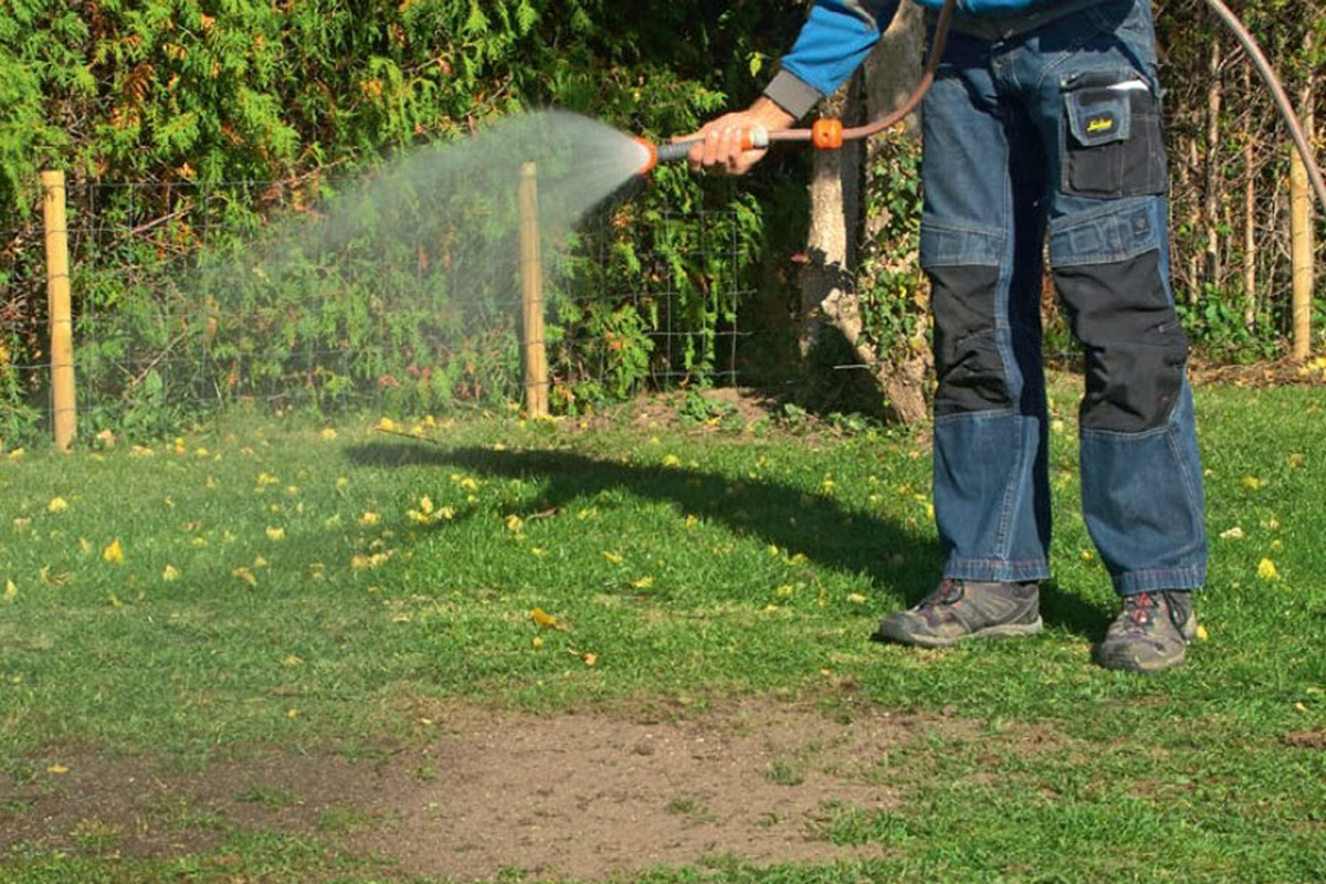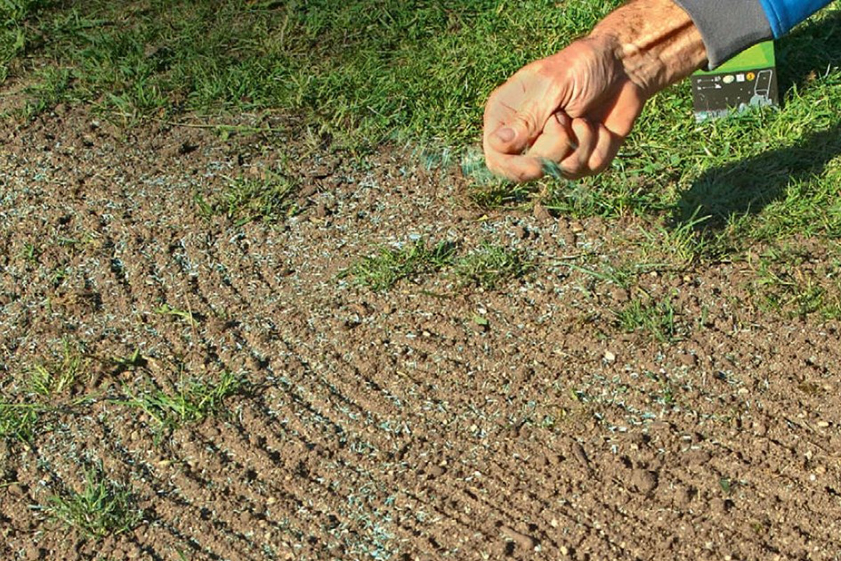 Fordel græsfrø jævnt over området. Græsfrøene her er behandlet med gødning. Bruger du almindelige græsfrø, kan du med fordel gøde jorden let.