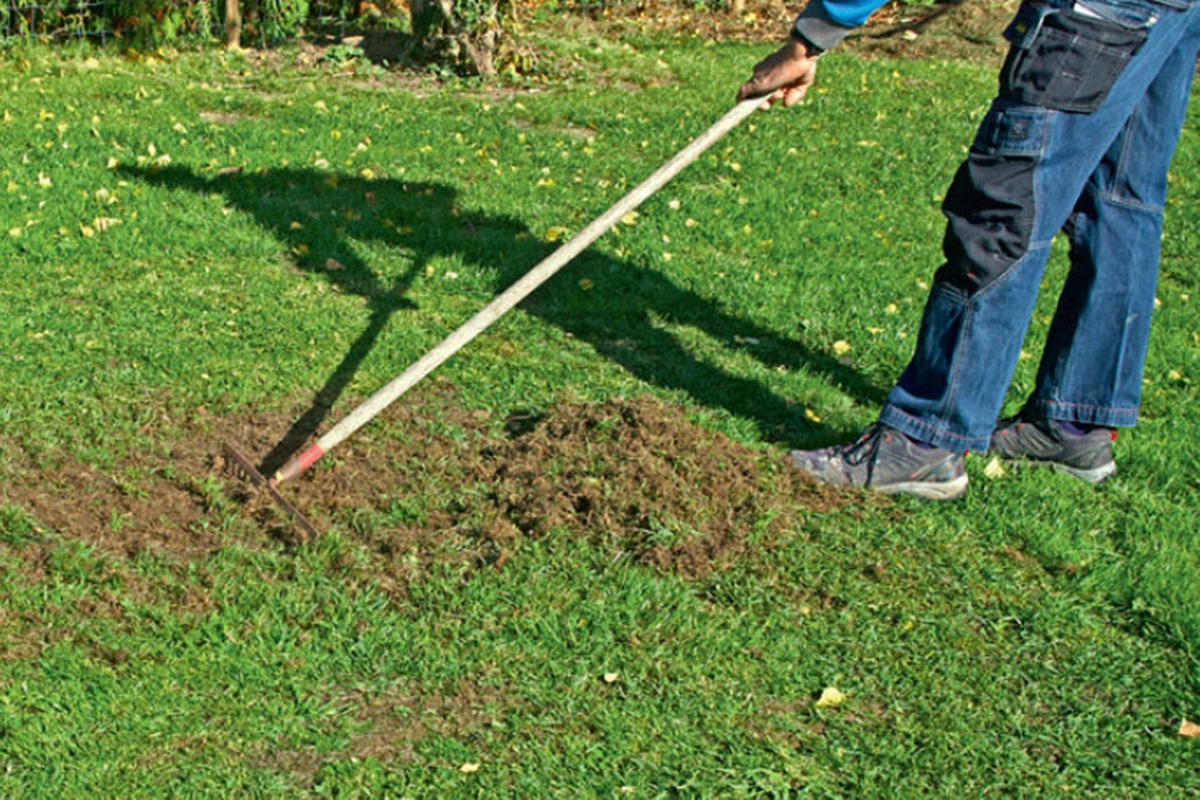 Riv området grundigt. Sørg for at rive helt i bund, så du får løsnet vissent græs, mos, blade, og hvad der ellers gemmer sig nede mellem græsplanterne.