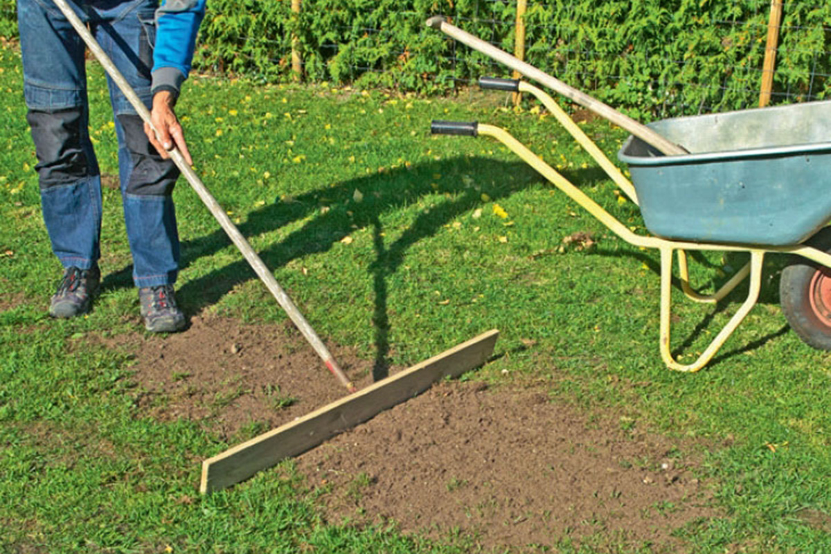 Fordel en passende mængde jord på området. Læg jorden ud i små bunker. Det gør det lettere at vurdere, hvor meget jord der skal til at fylde fordybningen op.