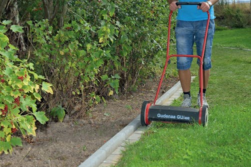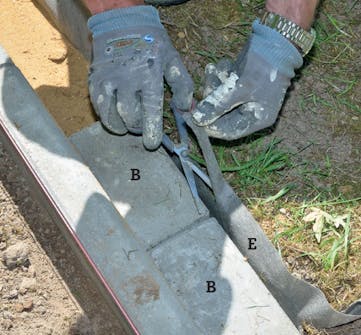 Fiberdugen (E) klippes af i niveau med overkanten af betonstenene (B). Græsset vil hurtigt dække kanten helt.