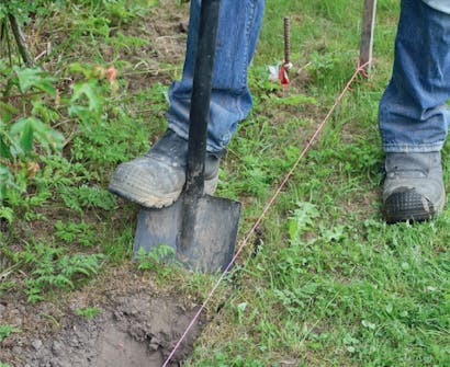 Vi starter med at grave muld væk. Retningen har vi markeret med en snor, så kanten mod græsset ligger præcist. Mulden skal væk, og der skal være plads til mindst 5 cm beton under kantstenen. Her graver vi 25 cm ned i jorden.