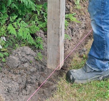 Nu sætter vi snoren op igen. Plæner er sjældent helt plane, og snoren sættes, så kantstenen mindst rager 5 cm op over terrænet, men samtidig højst stikker halvdelen af sin højde op af jorden.