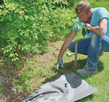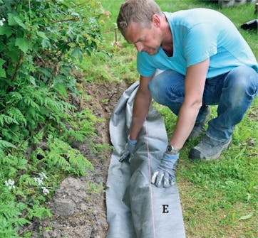 Renden fores med fiberdug (E). Den skal forhindre rødder og græs i at arbejde sig ind mellem stenene i kanten.