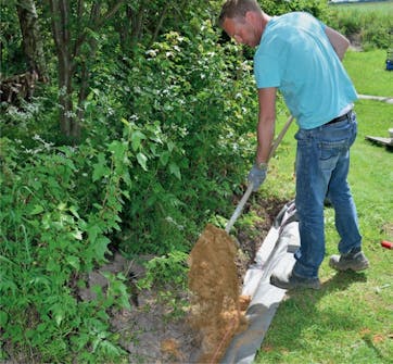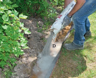 Betonen (D) drysses tør i bunden af renden. Vi har valgt at bruge sække færdigblandet beton. Du sparer en del ved selv at blande grus og cement, men det her er langt enklere og giver ofte mindre spild.