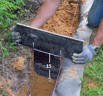 Gruset i renden retter vi af med en helt enkel skabelon skåret ud af en rest krydsfiner. Den har form som et T med rundede hjørner, hvor den lodrette tunge rækker 15 cm ned fra den vandrette del.