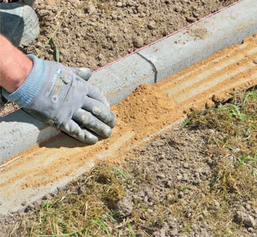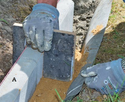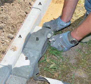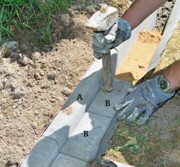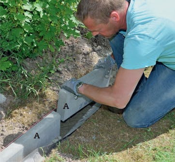 Kantstenene (A) sættes nu efter snoren. Husk at holde 2 mm luft til snoren, så stenene ikke skubber til den. Sørg for en fuge på 2-5 mm mellem kantstenene, så du kan lukke dem tæt i med fugesand.