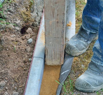 Med tørbetonen opbygges en trekantet støtte på begge sider af blokkene, cirka 5 cm i bredden og 10 cm i højden. Tjek løbende, at blokkene stadig følger snoren - med afstanden 2 mm.