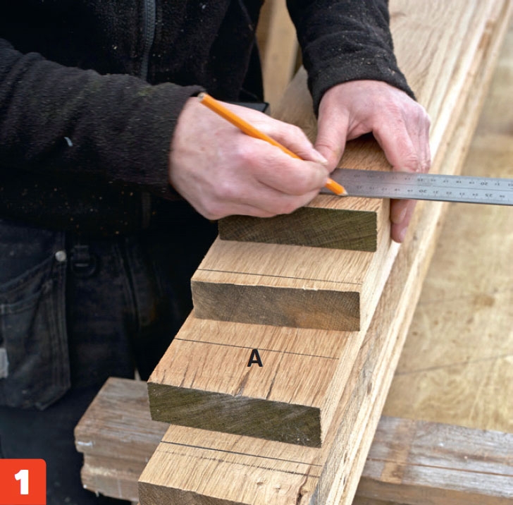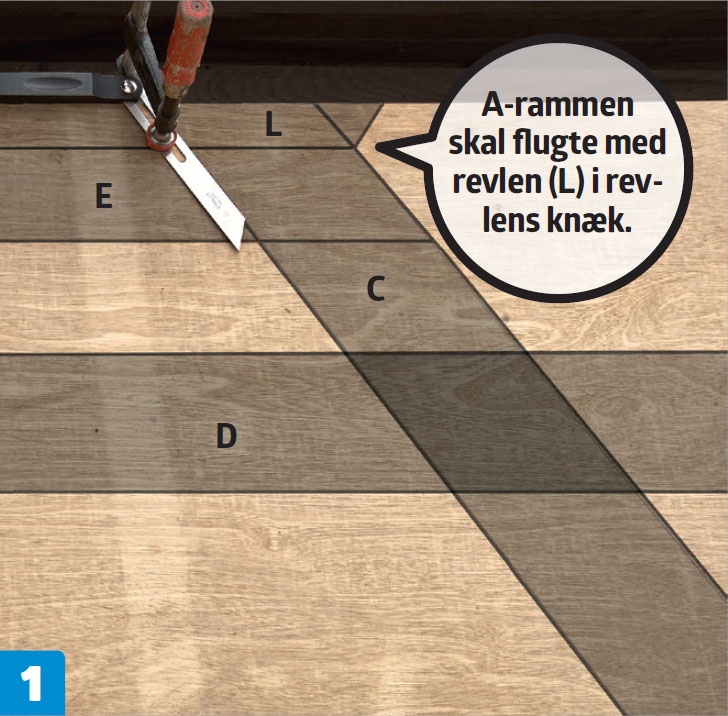 På undersiden mærkes op til den midterste revle (B). Revlen centreres og rettes ind efter en tømmervinkel.