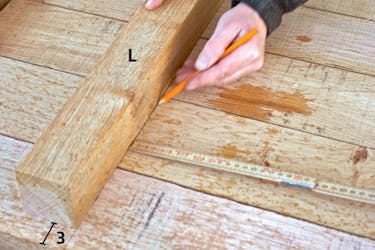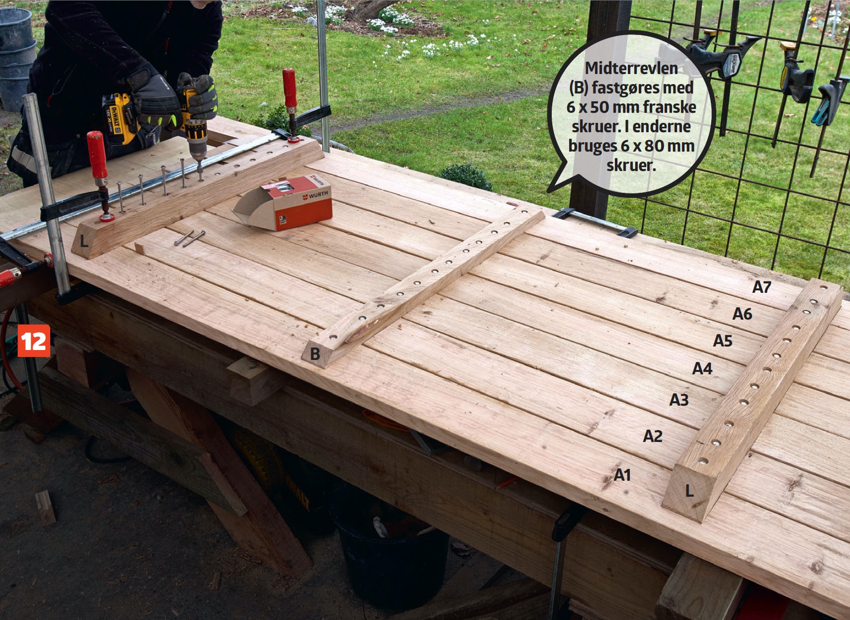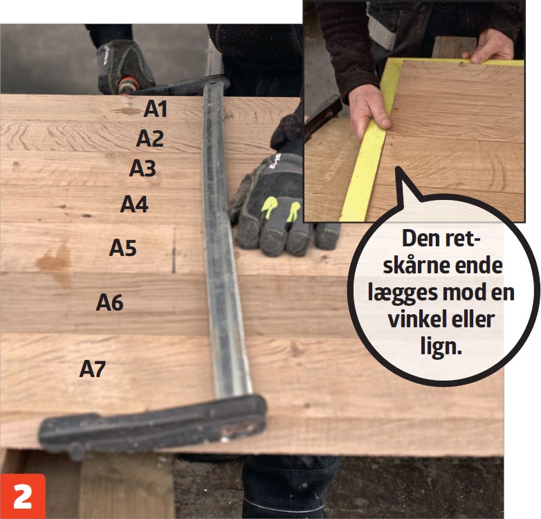 Brædderne (A) til bordpladen streges over i 90 grader i den ene ende ved hjælp af en vinkel. Brædderne skæres derefter over langs stregen for at sikre en lige kant.
