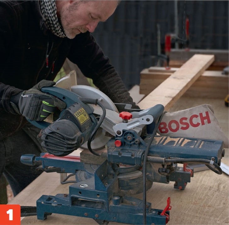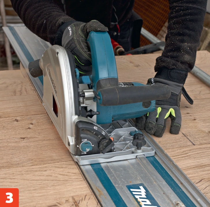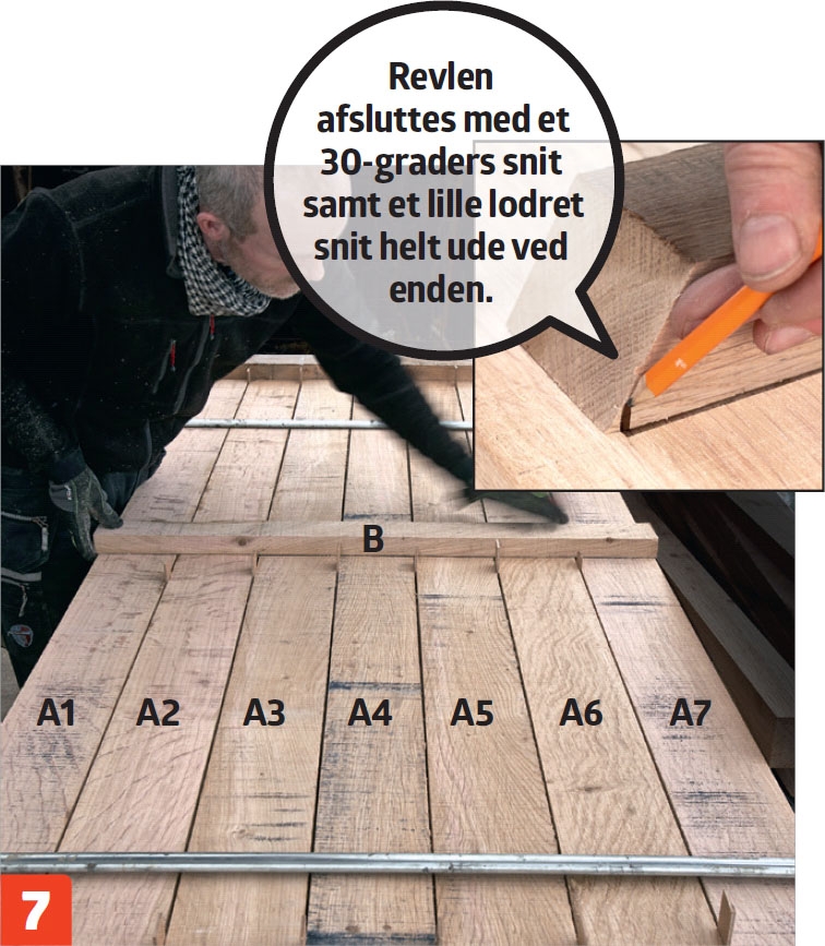 På de yderste brædder (A1 og A7) kører sporet ikke til kant. Sav derfor forsigtigt med kapsaven indtil 2 cm fra kanten. Sporet stemmes rent med en lodret bagkant.