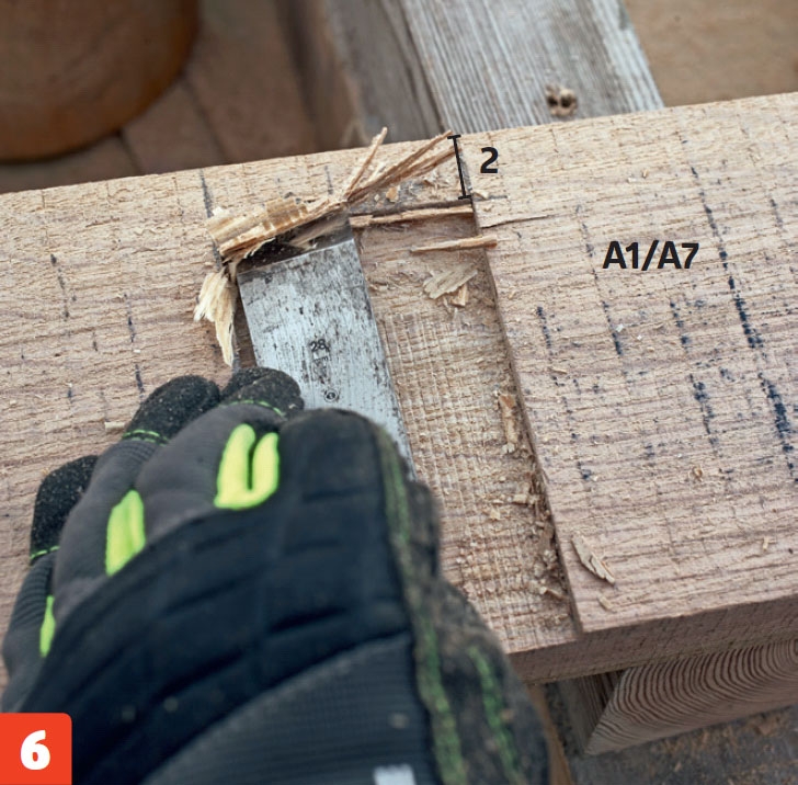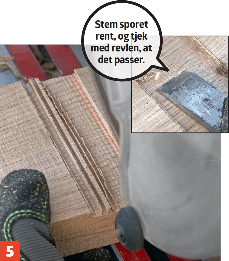 Skil bordpladen ad, og sav ud til revlen i de midterste fem brædder (A2-A6) med en kapsav. Indstil dybden til 5 mm, og sav en stribe spor. Stem rent med et stemmejern.