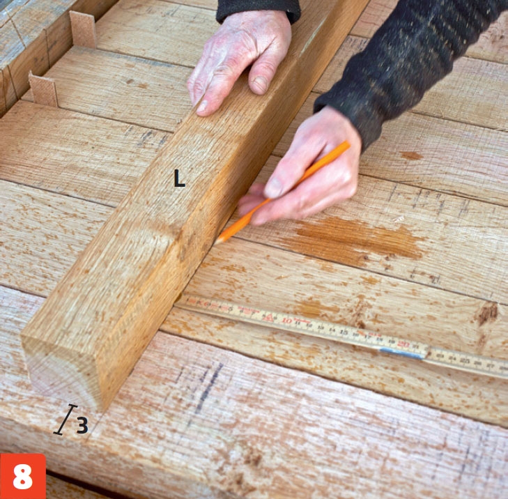 De to resterende revler (L) mærkes op med den midterste revle (B) på plads til at fiksere. Processen med at lave sporet er den samme som før - blot rykkes sporet 3 cm ind fra kanten på de yderste brædder.