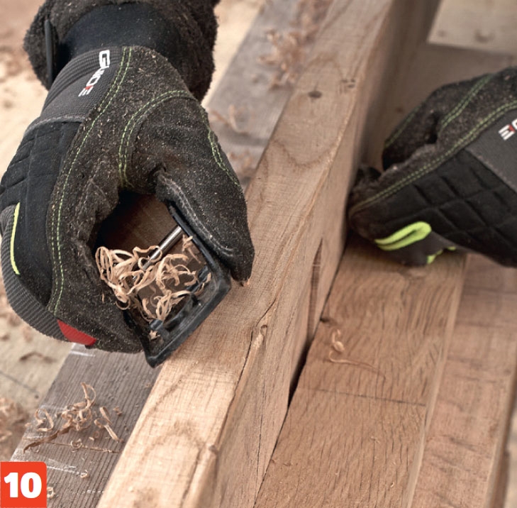 Bolte og møtrikker undersænkes med et spadebor. Centerspidsen passer i de forborede huller. Når undersænkningen er på plads på begge sider af samlingen, bores alle hullerne op med et 10-mm bor.