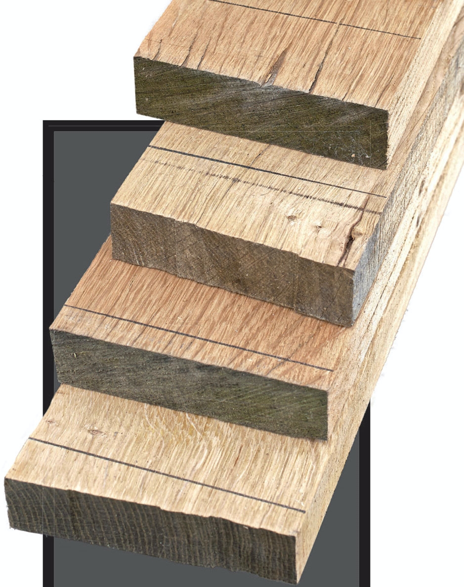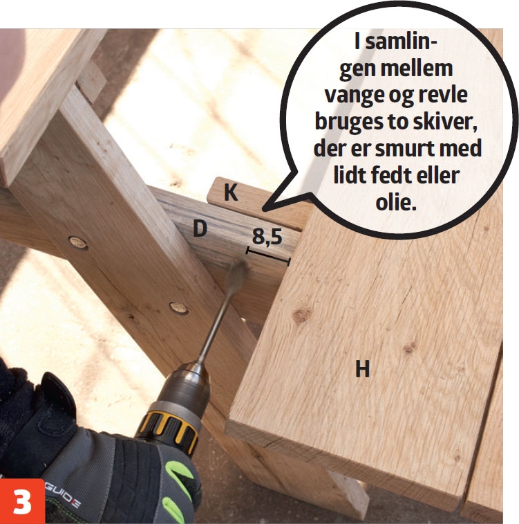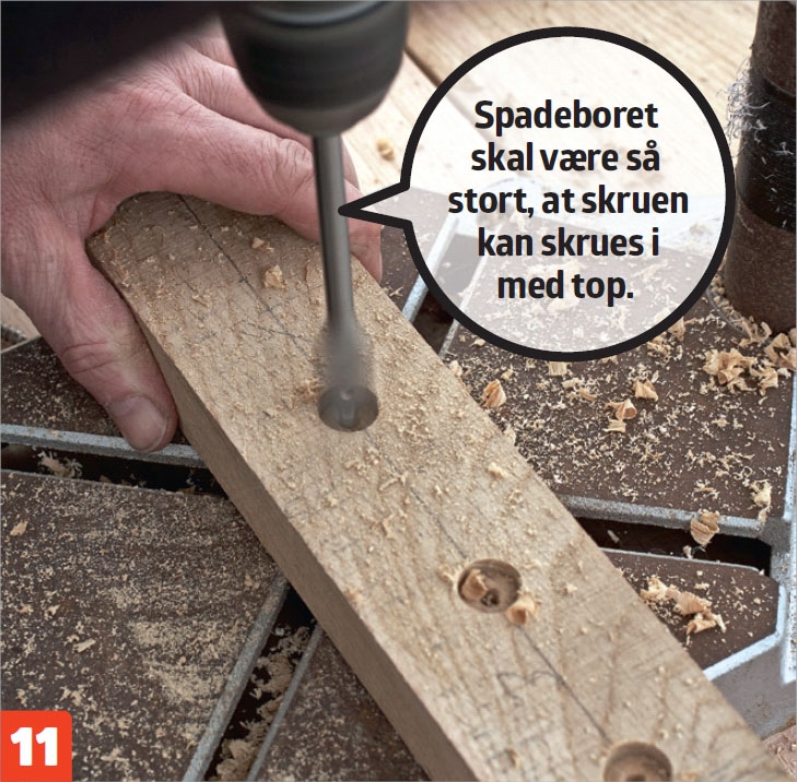 Revlerne forbores med et 4-mm bor, og skruerne undersænkes med et spadebor. Egetræ er hårdt, så det pæneste resultat fås med en søjleboremaskine eller en borestander.