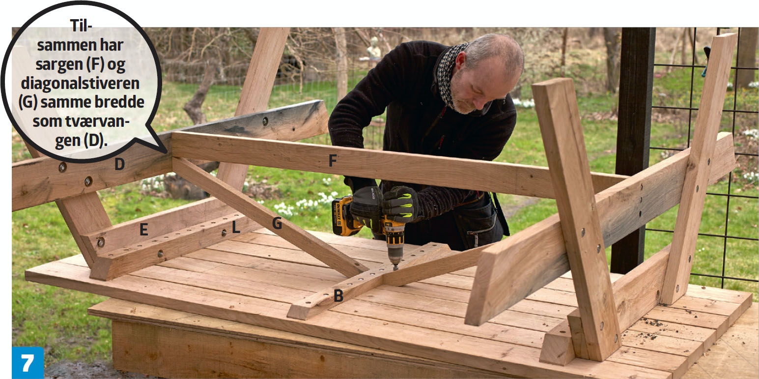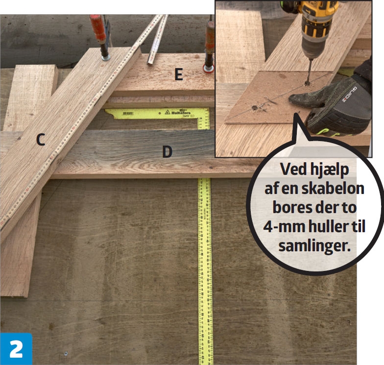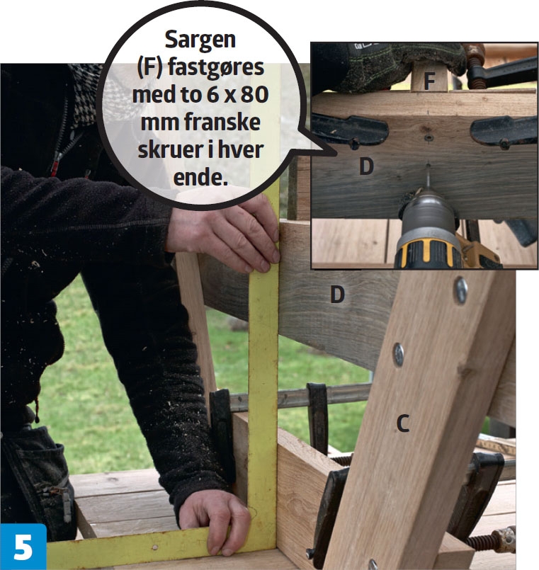 Bordpladen lægges med bunden i vejret, og rammerne tvinges fast. Sargen (F) saves til og fikseres med tvinger, så undersiden flugter med undersiden af tværvangen (D). Den bores for, undersænkes og fastgøres.