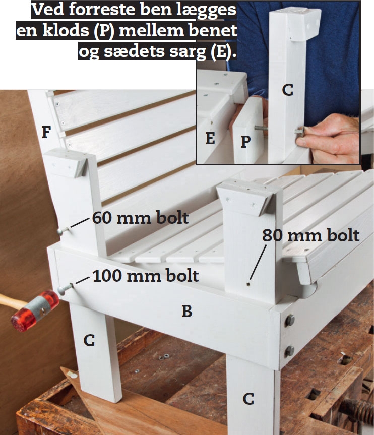Bordbenene (G) gøres fast. Bagtil får de foroven en 60 mm bolt gennem ryggen (F), forneden en 80 mm bolt gennem sarg (E) og ryg (F). Foran gøres fast med en fransk skrue gennem rammen (A) og en 80 mm bolt gennem en klods (R) og sargen (E).