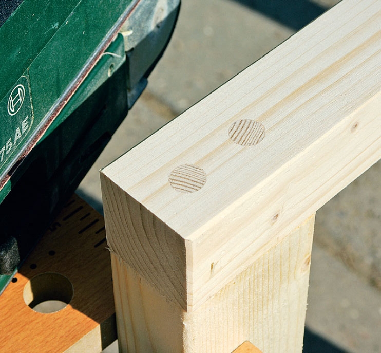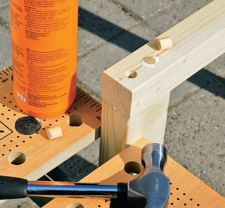 Sav dyvlerne ud af en 13 mm rundstok. Sørg for, at de er lidt længere end hullernes dybde. Smør lim i hullerne, og slå dyvlerne i.