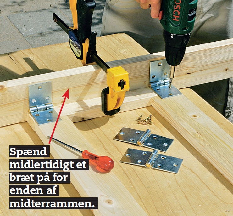 Spænd et bræt på for enden af midterrammen til at støde hængslerne op imod. Så bliver det meget lettere at skrue dem fast, og de sidder på den rigtige plads. Brug 4,0 x 20 mm skruer til opgaven.