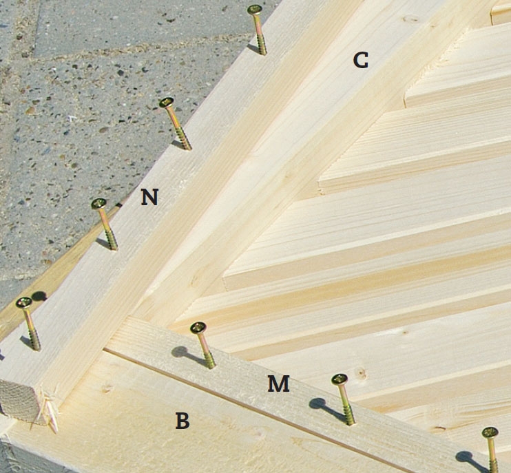 Når alle lister er lagt midlertidigt på plads i bordets ramme, skal fals-listerne (M) og (N) skrues på. Brug 4,0 x 40 mm skruer til at samle delene.