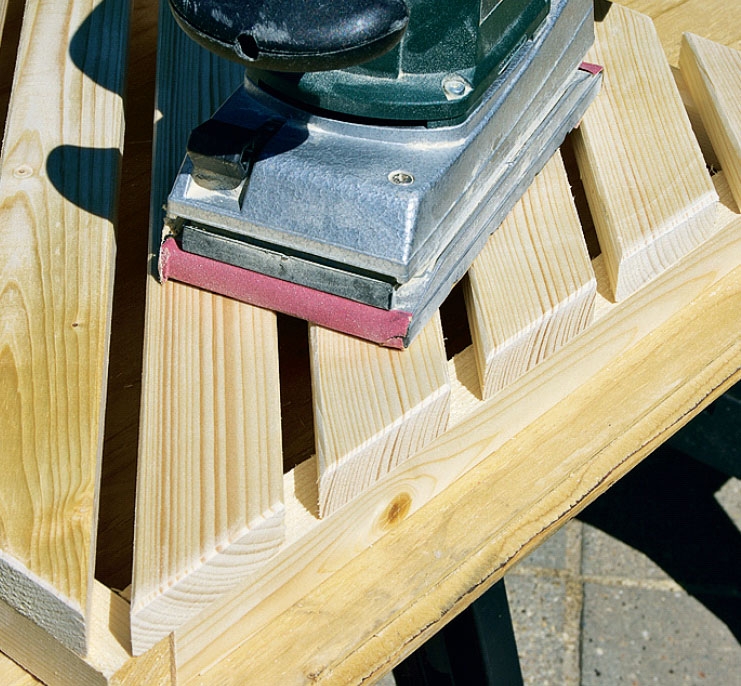 Fyldingerne til bordet og bænken laver vi i dette tilfælde med 19 x 45 mm lister. Vi afkorter listerne med snit på 45 grader og placerer dem i et sildebensmønster. Men du kan naturligvis også vælge at lade listerne i fyldingen forløbe parallelt med selve rammen. Men valgmulighederne stopper ikke her. Hvis du foretrækker det, kan du erstatte trælisterne med fliser. Målet på fyldingerne giver nemlig plads til fliser i formatet 40 x 40 cm. Det er blot din egen smag og pengepungens størrelse, der bestemmer, hvad du foretrækker.
