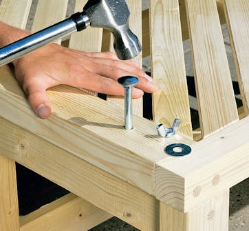 Saml benrammerne med 6,0 x 100 mm skruer, og prop hullerne ud med dyvler, som du gjorde, da du samlede rammerne. Se punkt 3 og 4 på siden til venstre.