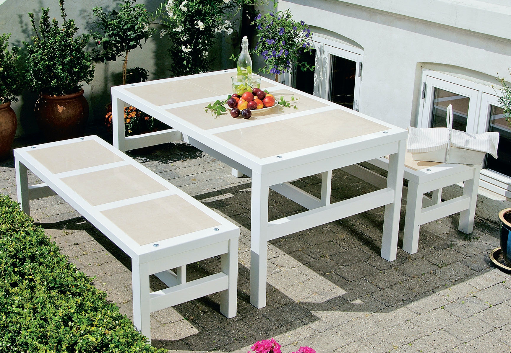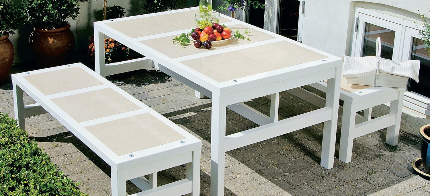 Bordet og bænkene kan laves i flere variationer. Målet på fyldingerne gør, at man kan bruge fliser på 40 x 40 cm i stedet for at beklæde med træ. Fliserne ligger løst oven på understøtningerne, så du tager simpelt hen fliserne op, når sættet skilles ad. Der er masser af fliser at vælge imellem, så der er alle muligheder for at lave et helt unikt møblement.