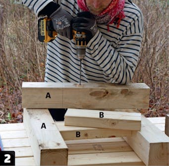 Der bores for i benene (A) til vangerne (B og C), der er skåret til på kapsaven. Vangernes underkant sættes 41 cm fra benenes underkant. Hullerne bores med et 5-mm-bor og undersænkes med et 10-mm-bor.