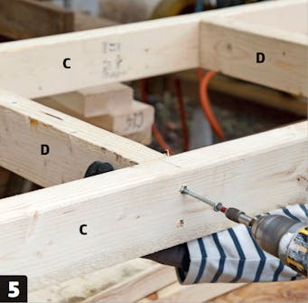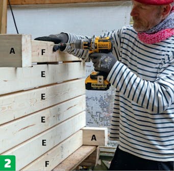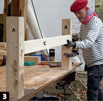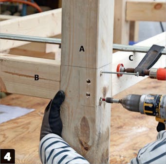 De korte vanger (B) fastgøres med lange skruer, 6 x 150 mm. Delene holdes sammen med tvinger, mens de skrues fast. Bemærk, at skruehullerne er placeret forskudt, så skruerne ikke ramler sammen.