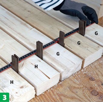 Reglarne til ryglænet (G og H) lægges op med afstandsstykker imellem, så afstanden er ens. Mål, hvor højt ryglænet er. Målet er højden på de to yderste rammestykker (J) bag ryglænet. Sav rammestykkerne til.