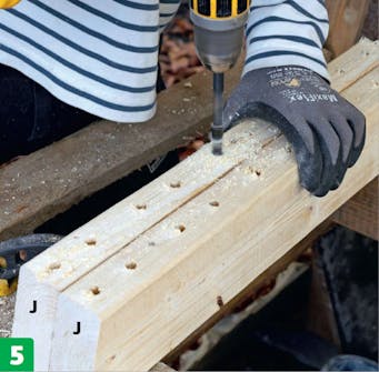 Bor for i de to yderste rammestykker (J), så træet ikke flækker. Der laves to huller til hver reglar i ryglænet. Hullerne bores med 5-mm-bor og undersænkes bagefter på det øverste stykke med et 10-mm-bor.