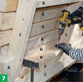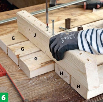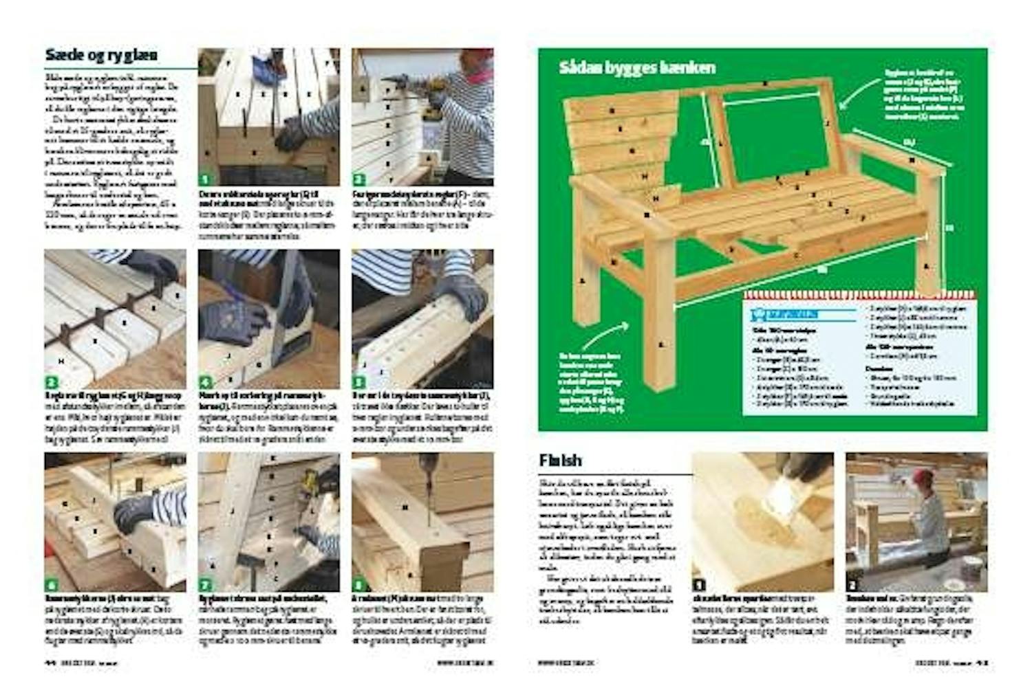 De korte rammestykker (J) skal skæres til med et 15-graders snit, så ryglænet kommer til at hælde en smule, og bænken bliver mere behagelig at sidde på. Der sættes et tværstykke op midt i rammen til ryglænet, så det er godt understøttet. Ryglænet fastgøres med lange skruer til understel og ben.