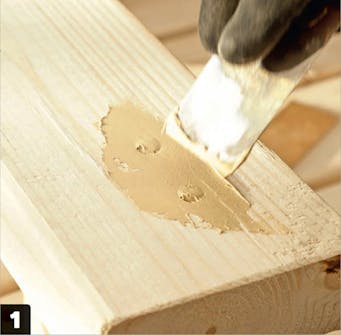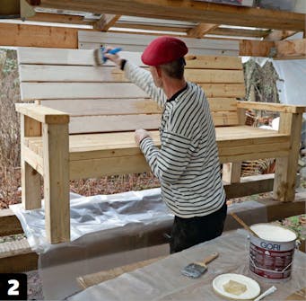 Hvis du vil have en flot finish på bænken, bør du spartle alle skruehullerne med træspartel. Det giver en helt ensartet og jævn flade, så bænken står knivskarpt. Løb også lige bænken over med slibepapir, som tager evt. små ujævnheder i overfladen. Husk at fjerne alt slibestøv, inden du går i gang med at male.