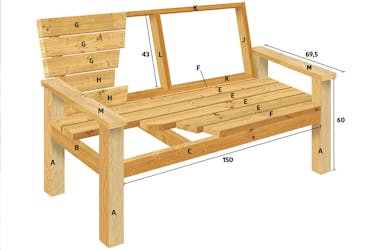 Bænkens ben (A) er bygget af en stolpe, der deles i fire stykker a 60 cm. De placeres i hvert hjørne og forbindes med vanger af reglar - to lange (C) og to korte (B) stykker.