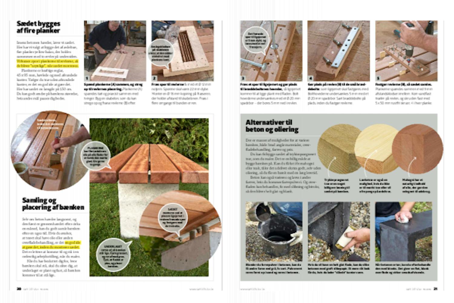 Imens betonen hærder, laver vi sædet. Her har vi valgt at bygge det af ædeltræ, fire planker yellow balau, der holdes sammmen med to revler på undersiden. Vi fræser spor i plankerne til revlerne, så de bliver ”usynlige”, når sædet monteres.