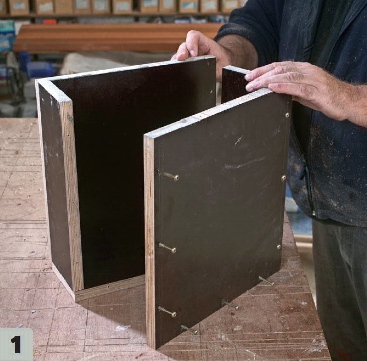 Saml støbeformen, når du har savet krydsfineren til. Vi bruger 5 x 50 mm rundhovedede skruer. De placeres, så de er nemme at ”komme til”, når formen skal åbnes, og betonen tages ud.