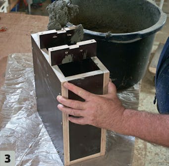 Bland betonen, og fyld den i formen. Den skal røres op til en lind masse, der kan flyde sammen i formen. Undervejs stampes betonen med en stump liste, som sikrer, at den kommer ud i alle hjørner og kanter.