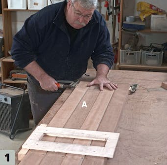 Spænd plankerne (A) sammen, og streg op til revlernes placering. Plankerne (A) spændes tæt og præcist sammen med tvinger. Byg en skabelon, som du kan strege op og fræse revlerne (B) efter.
