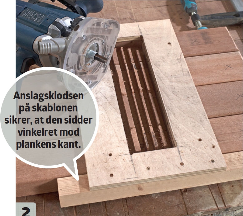 Fræs spor til revlerne fx med et Ø 12 mm notjern. Sporene skal være 22 mm dybe. Monter en Ø 18 mm kopiring på fræseren, der holder afstand til skabelonen. Fræs i flere omgange til bunden er ren.