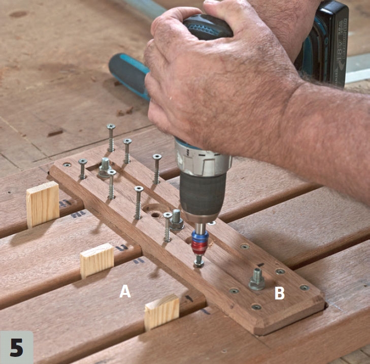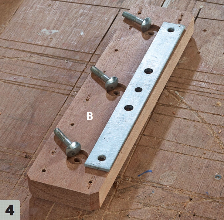 Gør plads på revlen (B) til de små bræd-debolte, som ligejernet skal fastgøres med. Bolthovederne undersænkes 5 mm med et Ø 20 mm spadebor. Sæt bræddebolte på plads, inden du fastgør revlerne.