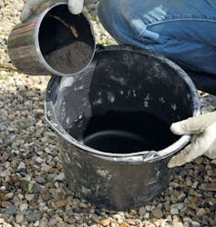 Betonen laves her af færdigblandet grovbeton, der købes i sække og blot skal blandes med vand. Her bruges ca. 26 kg beton til hvert ben.