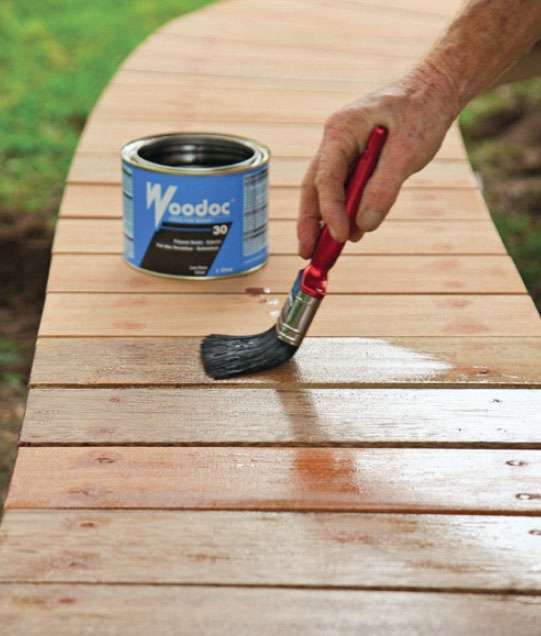 Giv bænken træolie. Smør olien hurtigt ud på bænken, slib den godt ind i træet med vådslibepapir, og tør overskydende olie af. Gentag næste dag efter en let tur med slibepapiret, og poler til sidst.