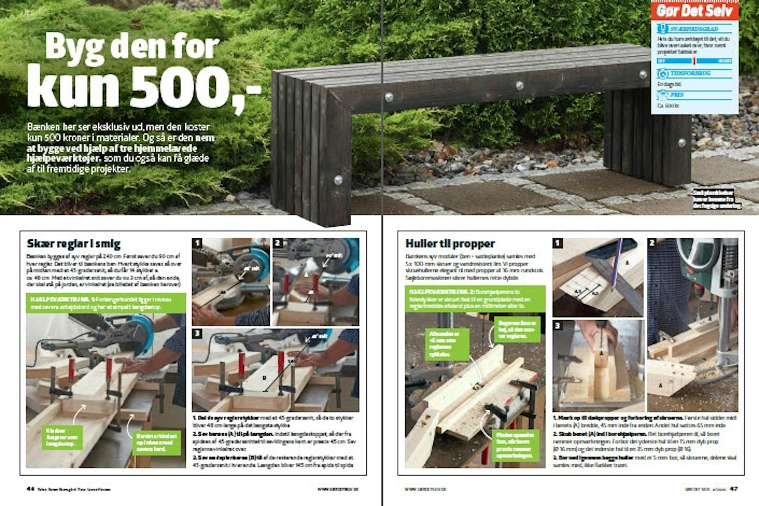 Bænken bygges af syv reglar på 240 cm. Først saver du 90 cm af hver reglar. Det bliver til bænkens ben. Hvert stykke saves så over på midten med et 45-graderssnit, så du får 14 stykker a ca. 48 cm. Med et vinkelret snit saver du nu 3 cm af, så den ende, der skal stå på jorden, er vinkelret.