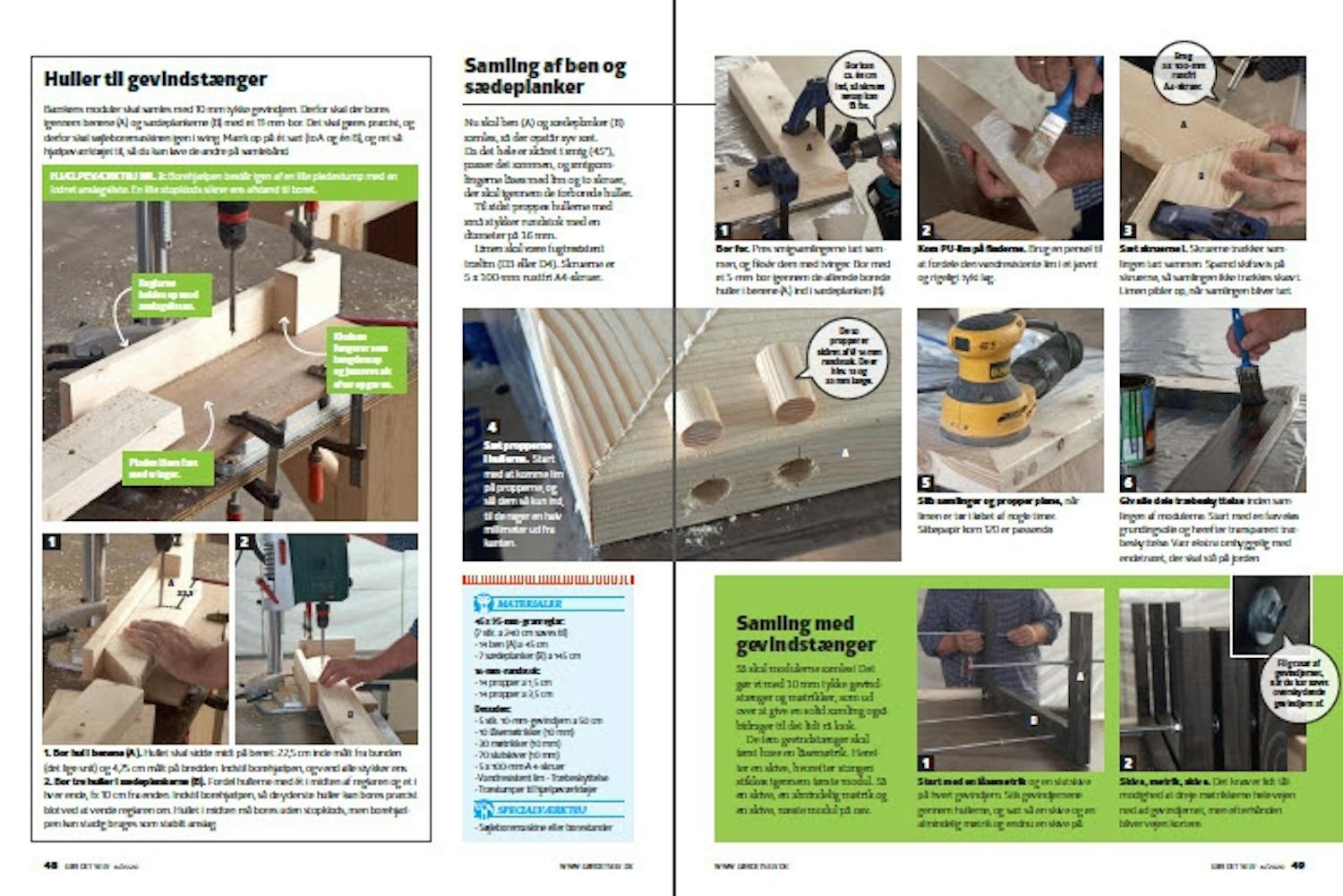 Nu skal ben (A) og sædeplanker (B) samles, så der opstår syv sæt. Da det hele er skåret i smig (45°), passer det sammen, og smigsam-lingerne låses med lim og to skruer, der skal igennem de forborede huller.