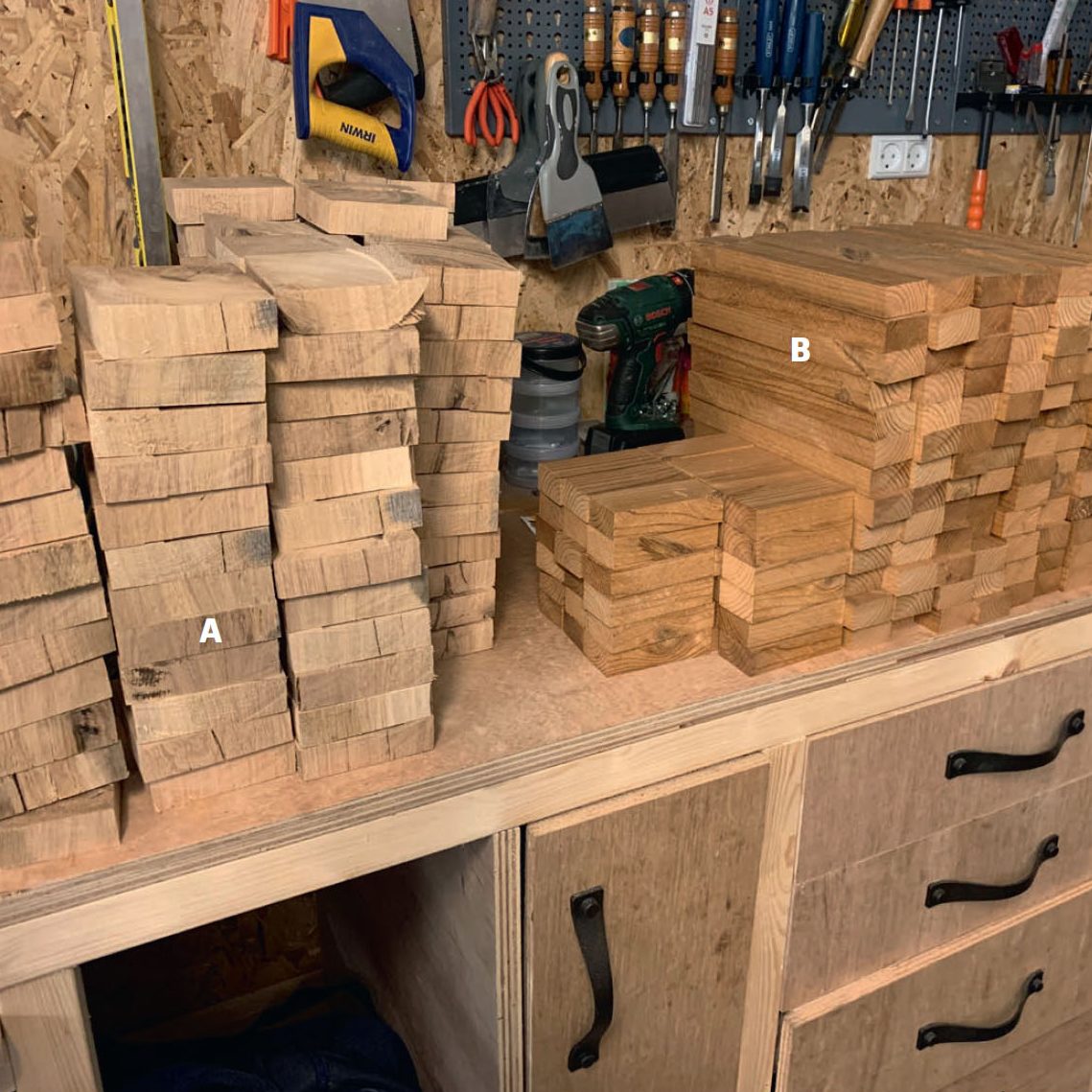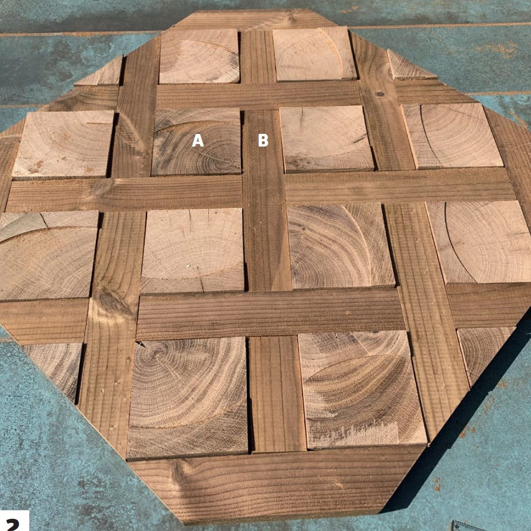 De kvadratiske klodser (A) skæres af egetræsstolper, og stavene (B), der sidder imellem klodserne, skæres af terrassebrædder, der er skåret ned til 5 cm i bredden. Både klodser og stave er 2,8 cm tykke. I alt skal der bruges mere end 280 dele til bordpladen.